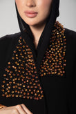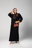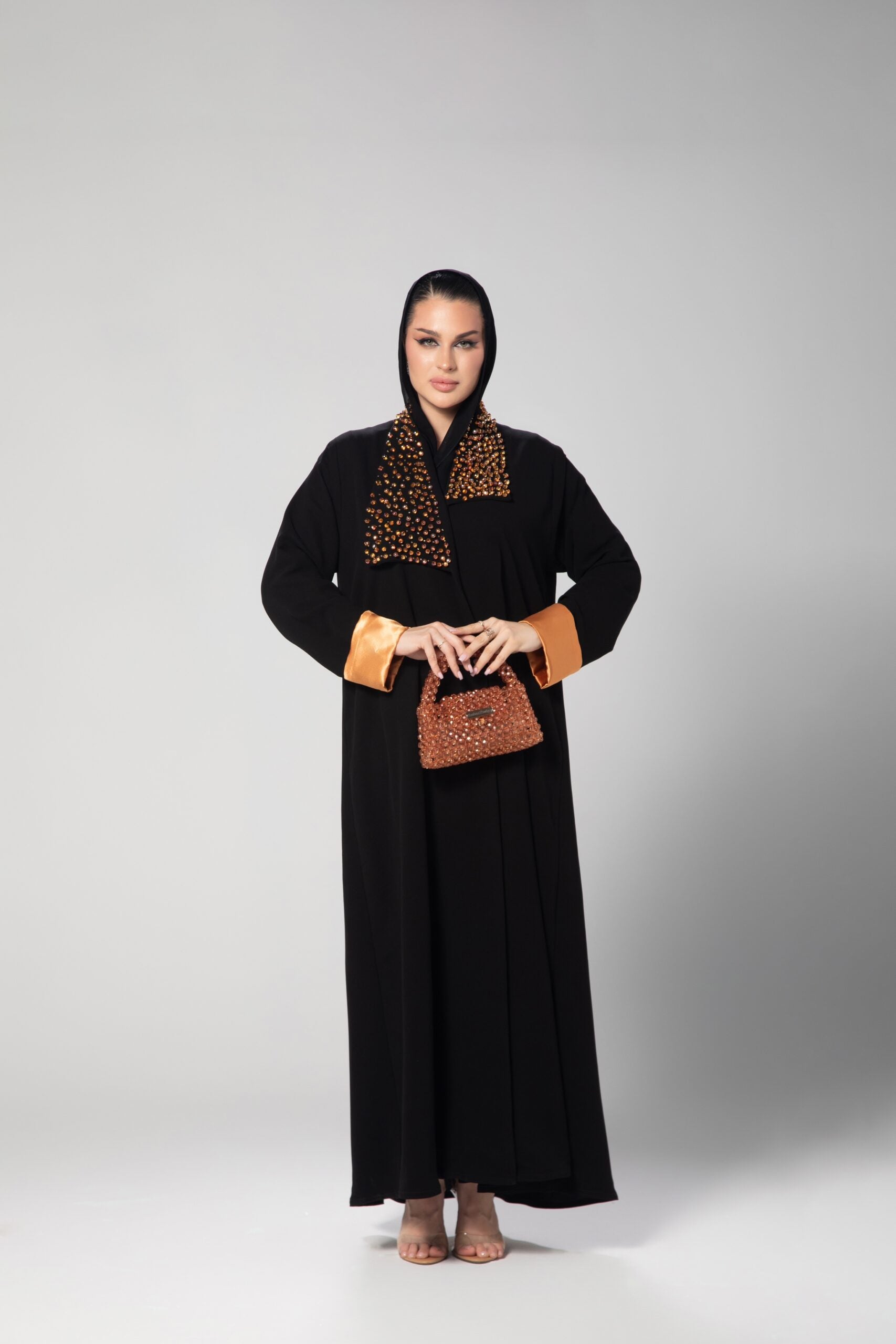 Black abaya lined with golden silk on the sleeves and encrusted with brown beads