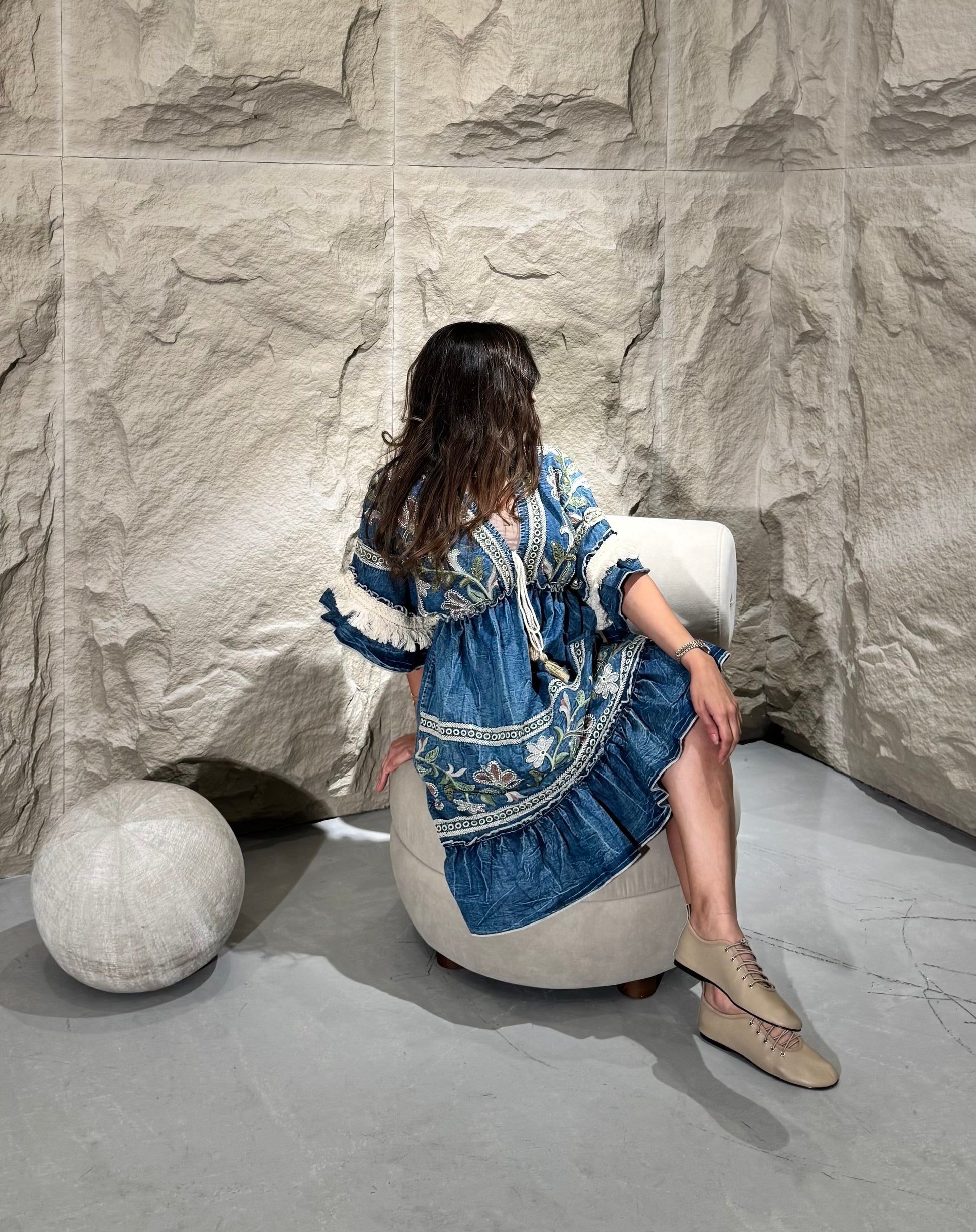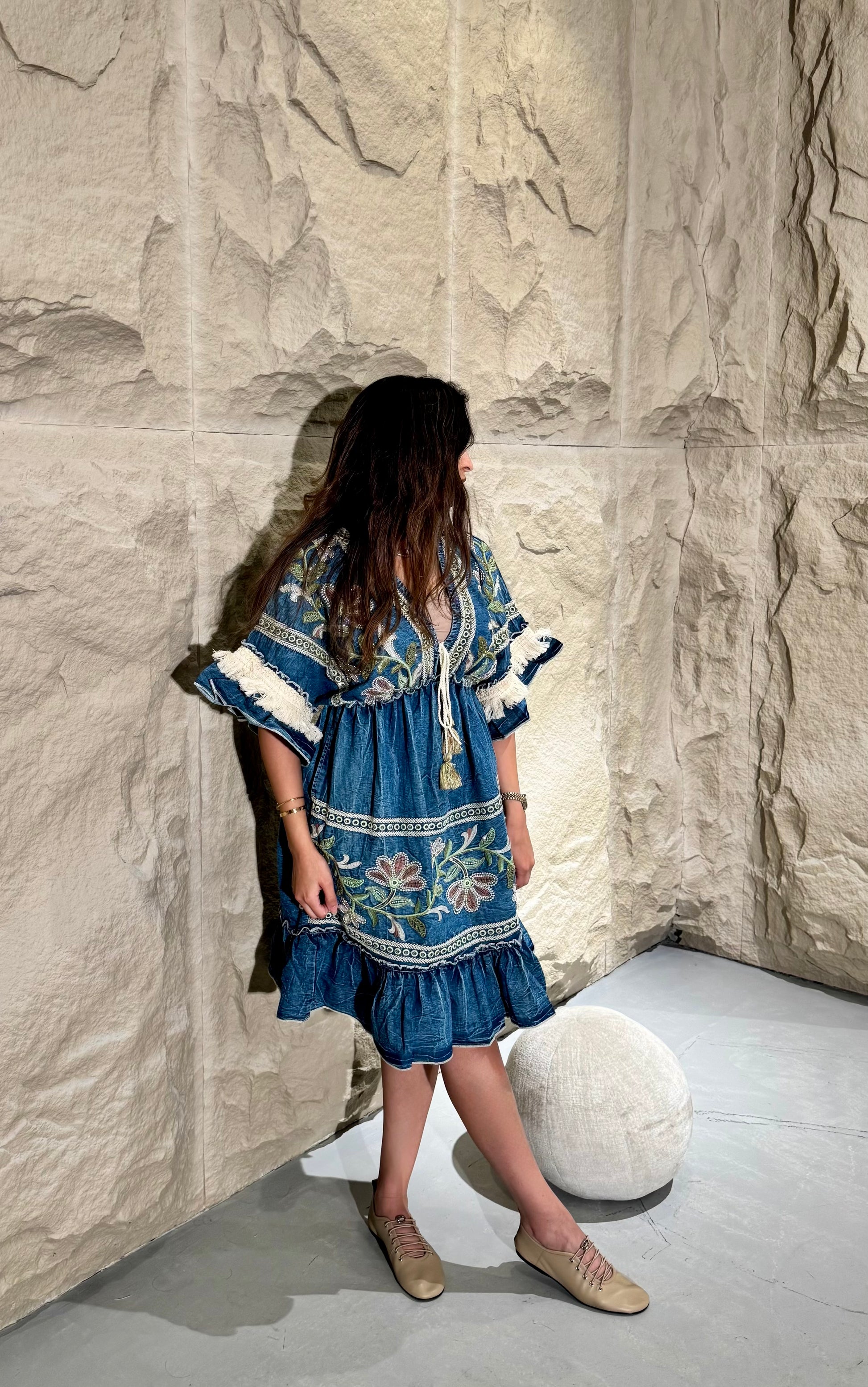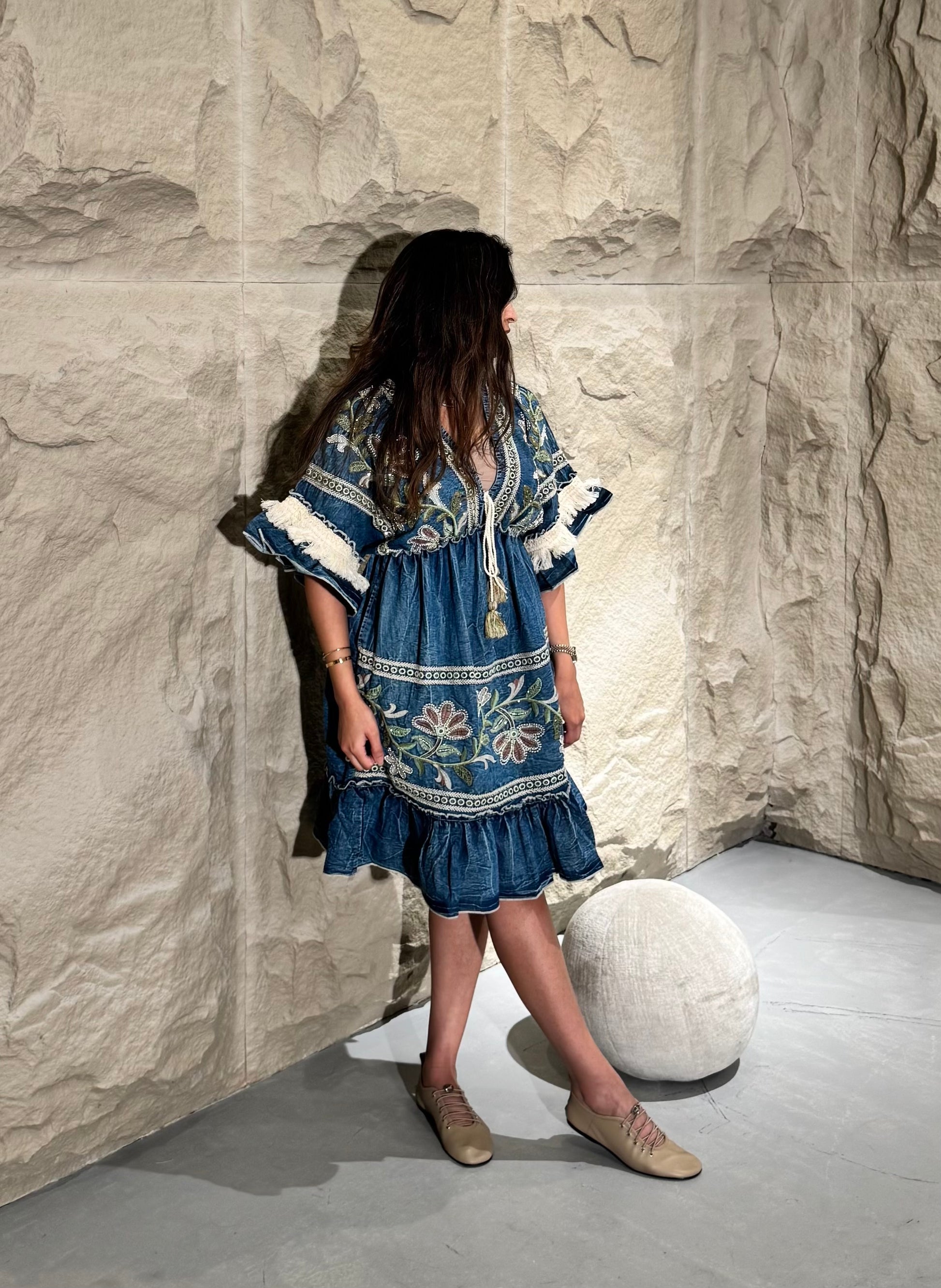 Mid-length dress with ramp, Hand embellings, Flavied style jeans, V neckline on the back with tied links, Size tightened by an elastic, Invisible pockets