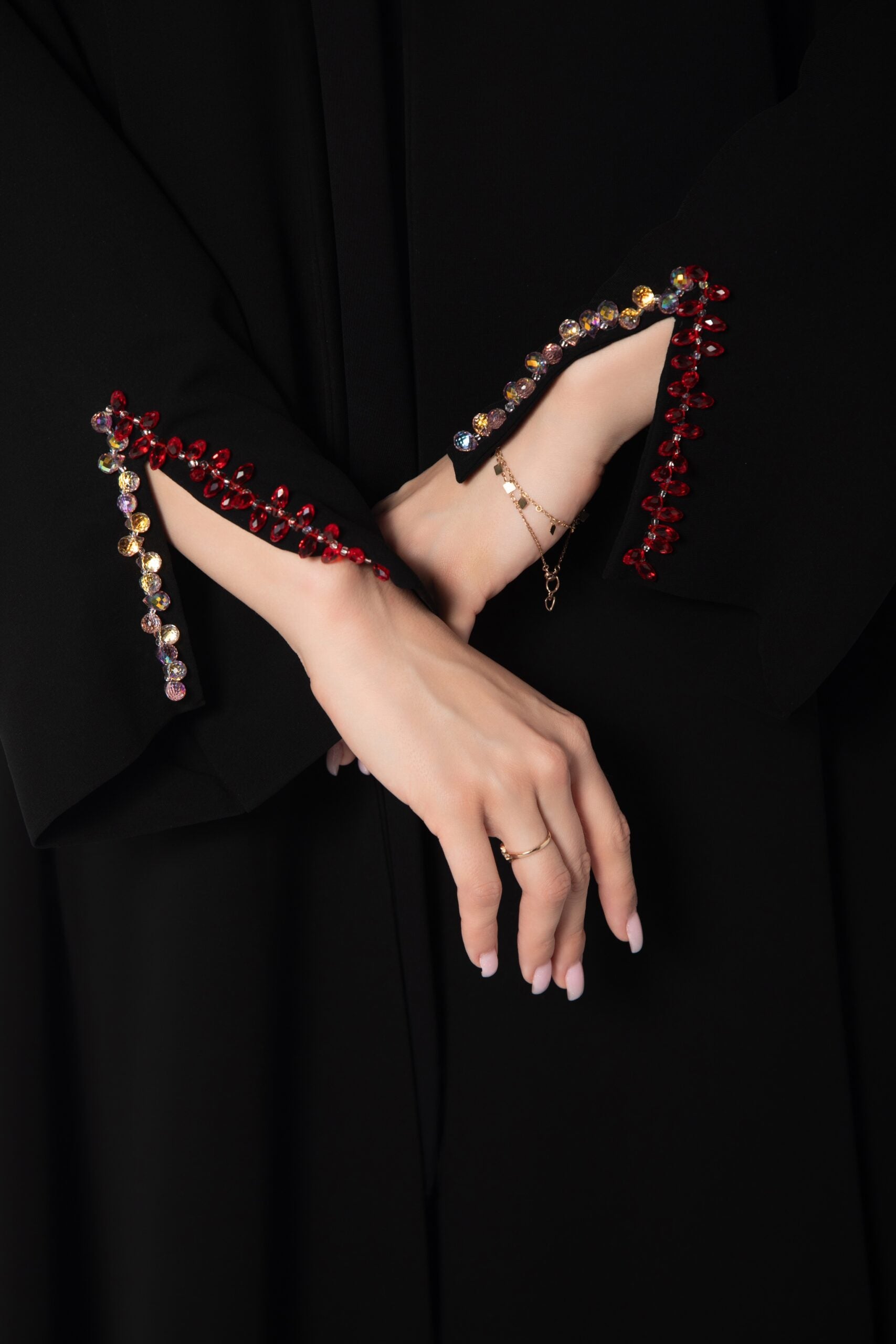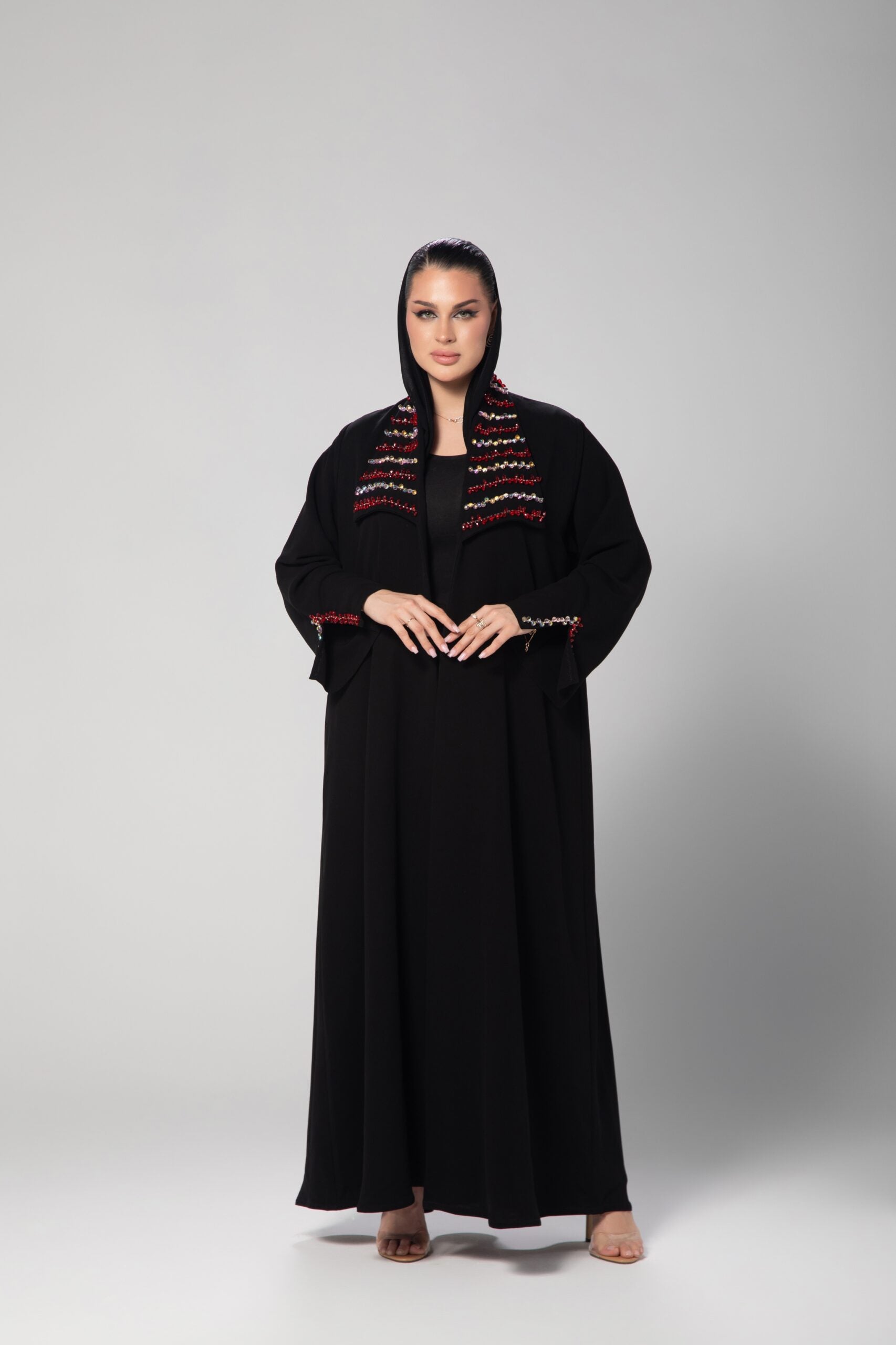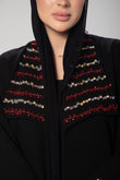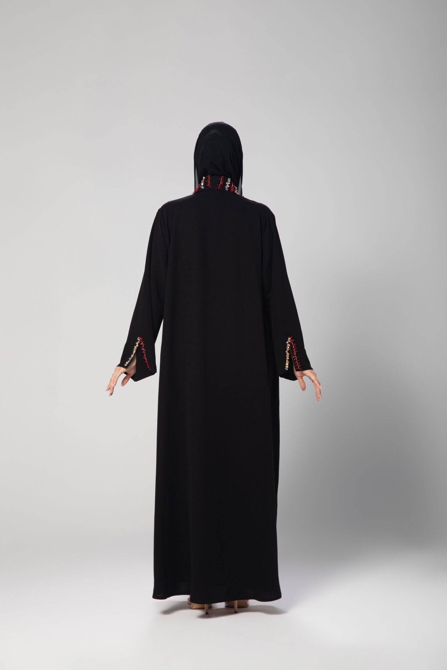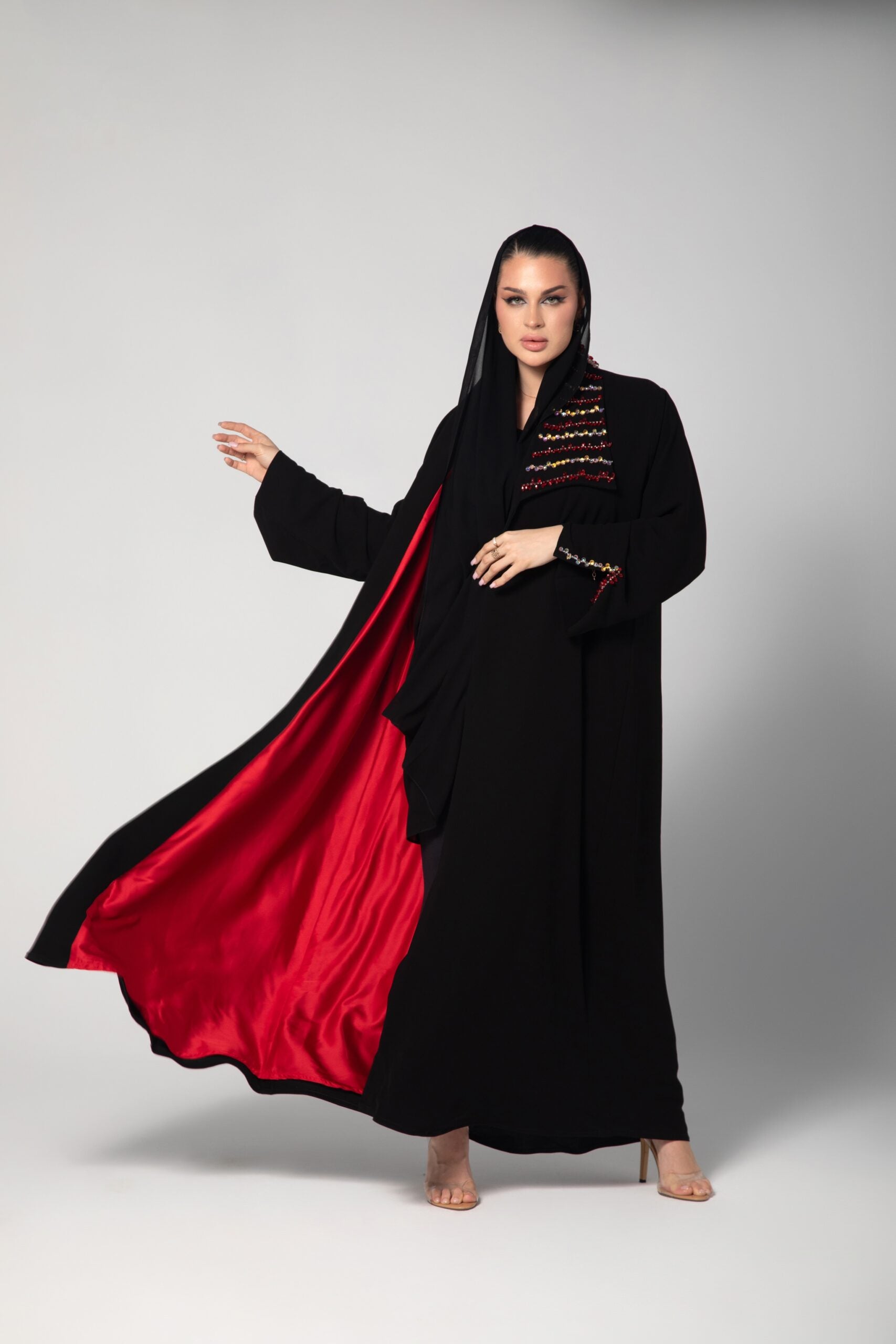 Black Abaya lined with red satin and encrusted with red and pink beads