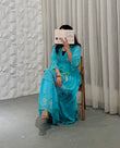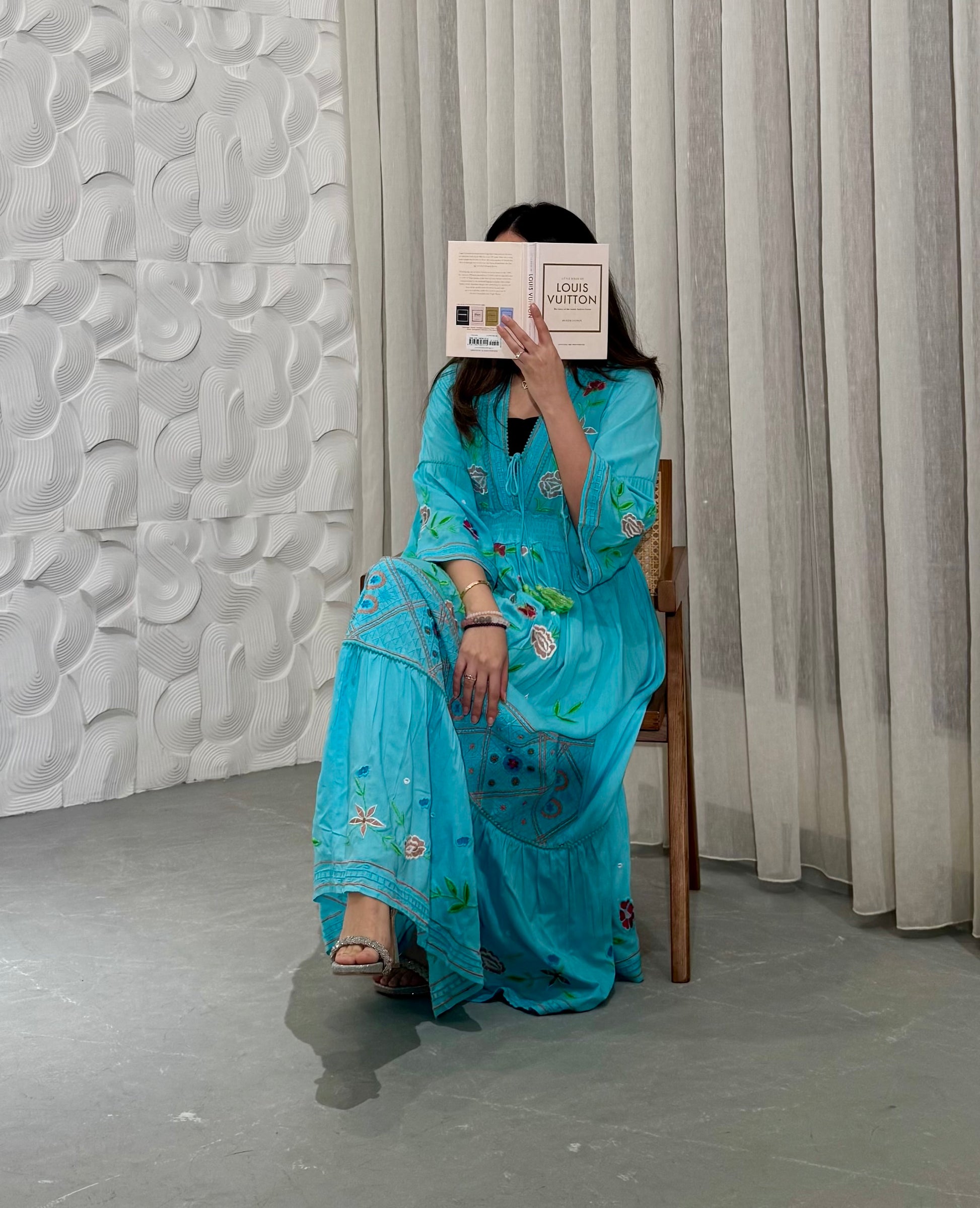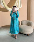 Mid-length printed dress, buttoned at the front with gathers, hand embroidery
